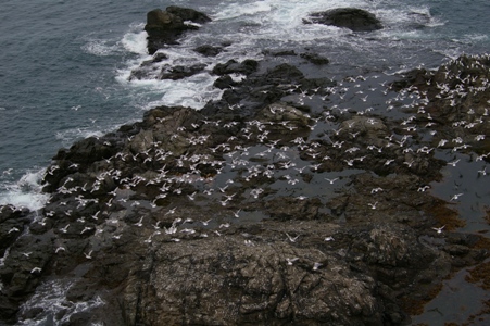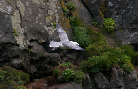 Nach dem Frühstück trennen wir uns erstmal, wollen uns aber später wieder treffen. Bei Tjörnes halte ich an, dort soll man gut Vögel beobachten können. Leider versperrt mir ein Zaun und ein “diesmal leider in Englisch geschriebenes” Schild “No Entry” den Weg. Als ich dann aber ein paar, eindeutig als Vogelbeobachter zu identifizierende, Leute von der anderen Zaunseite über das mit Stacheldraht versehene Tor klettern sehe, lasse ich mich von so einem blöden Schild auch nicht mehr aufhalten und stoße nach vielleicht 10 Minuten Weg auf Puffins (Papageitaucher), im wahrsten Sinne des Wortes “zum Greifen Nahe”, wie der Puffin Jäger eindeutig beweist (Puffins werden hier in Island gegessen). Hier halte ich mich, auf dem Boden robbend, bestimmt 2 Stunden auf. Zurück bei meinem Rad sehe ich Amanda und Olivier vorbeifahren. Ich lasse mir nicht nehmen den Island-Guide zu spielen und den beiden meine Entdeckung zu zeigen. Nachdem wir uns zusammen bestimmt noch mal 4 Stunden hier aufgehalten haben ist es 20:00 Uhr und wir beschließen die Räder über das Tor zu heben und den Hügel hochzuschieben und direkt hier zwischen tausenden von Puffins zu zelten. Wir halten natürlich rücksichtsvollen Abstand und haben uns auch keinen zum Abendessen gefangen.