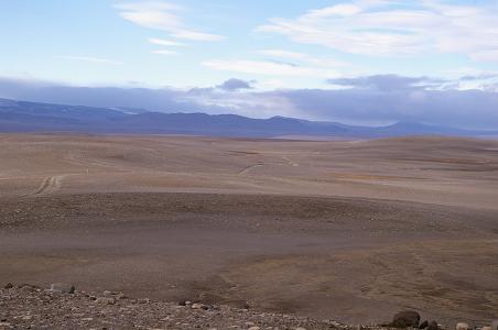 -> Planungsänderung! Umdrehen und die F881 und später die F26 (Sprengisandur) Richtung Aldeyjarfoss und Goðafoss. Überwiegend bergab lasse ich mich vom Rückenwind über die Piste jagen. Ich muss mich beherrschen, um nicht vor lauter Übermut zu schnell zu fahren. Die Straße ist um Längen besser als die F821, aber von Schlaglöchern, Wellblechprofil, Geröll und sandigen Wegstrecken werde ich auch hier nicht verschont. Bei den Bedingungen heute macht diese Cross-Strecke aber gerade den Reiz aus und die Abfahrt ist ein großer Spaß. Die sandigen Stellen sind gefährlich. Ich kann, jedesmal wenn ich zu schnell in eine solche Stelle fahre, einen Sturz nur mit viel Glück vermeiden. Danach fahre ich dann immer