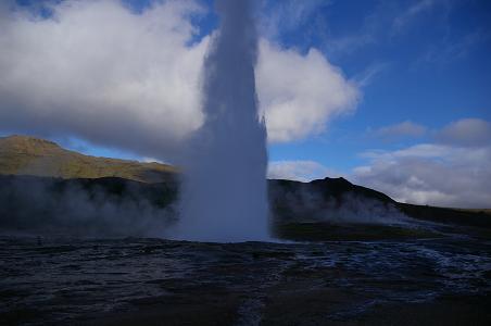 Die in busladungsgroßen Rudeln durchziehenden Touristen fallen mir hier nicht so massiv auf wie am Gullfoss. Lustig ist, dass hier wirklich alle dasselbe machen. Jeder läuft hier umher und sucht den seiner Meinung nach günstigsten Platz für das allerschönste Strokkur Foto. Dann steht man da und wartet mit langsam müde werdenden Armen auf den großen Moment. Dieser wird mit lauten Oh`s und Ah`s begrüßt und anschließend meist mit einem enttäuschten Ohh kommentiert, wenn man feststellt, dass das Foto wieder nichts geworden ist. Mal steht man so nah und der Ausbruch ist so gewaltig, dass man auf dem Foto eigentlich nichts mehr erkennen kann, mal hat man einfach den richtigen Moment verpasst oder ein anderer Strokkur-Jäger hat sich, ohne böse Absicht, aber sehr konsequent und absolut unübersehbar im letzten Moment genau zwischen dich und den Strokkur gestellt.